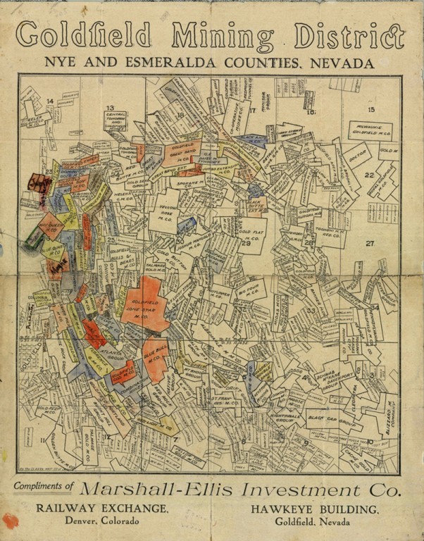 Issued as a broadside by Marshall-Ellis Investment Co., the Railway Exchange of Denver Colorado, and the Hawkeye Building, of Goldfield Nevada. Based on the map first published by Elmer J. Chute – Rand McNally of 1905 as a wall map and a pocket map. On this map three claims have been added to the west: the Pocahontas, Mayne and Jupiter. All three are listed in the 1909 edition of geological survey of Nevada.