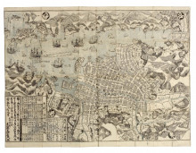 A superb map of Nagasaki, and one of the earliest examples of printing from the city.The upper and lower halves were each printed from two large woodblocks (one for the main map image in black including the outlines of the buildings and land; and the tint...