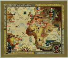 Eymonnet’s vibrant map, heightened in gold, is very much in the style of the planispheres created by Lucien Boucher for Air France. The image shows the origin of airline in Brazil and the many destinations that it reached at the time of the map. It...