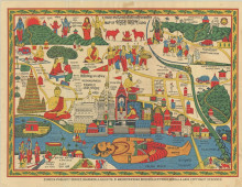This vibrant pictorial map of Gaya in India is oriented with west at the top, the title and place names are in English and in Hindi, the whole is surrounded by a border of vine-leaves.The map, possibly designed for those on a religious pilgrimage, cen...