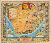 This charming souvenir map was created by Bernard Sargent for the South African Tourist Corporation. The map shows the major roads and the sites that can be seen along those roads, representing "diverse places and extraordinary manner of strange ...