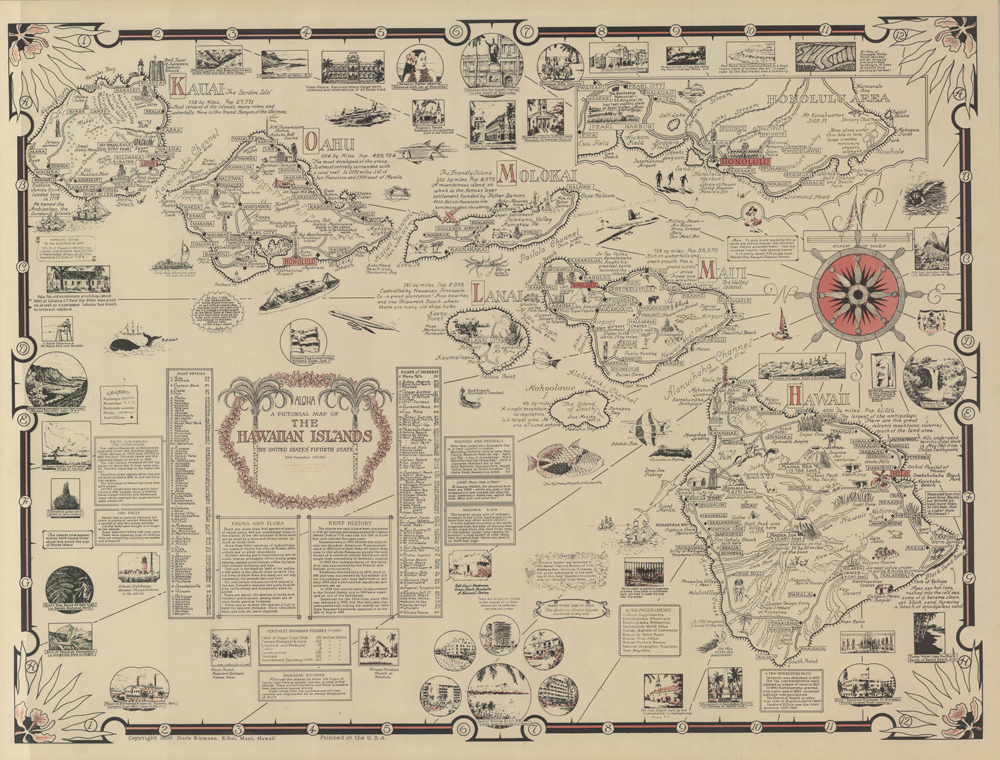 Published shortly after Hawaii’s acceptance as the 50th state of the United States, Chase’s is an elegant and detailed map, full of historical and practical information. Published by Doris Riemann, who according to Clark Fair of the “Mouth of Kenai”: “Russ and Doris Riemann, who came to Alaska in 1953 when Russ agreed to take over the managerial duties for a floundering Alaska News Agency, which was headquartered in Anchorage. In the late 1950s, the Riemanns parlayed their knowledge of the wholesale distribution of reading materials into a new retail establishment — The Book Cache — which would become Alaska’s preeminent bookselling business for the next three decades. Among its many retail outlets, The Book Cache included popular and profitable stores in the Carrs Mall in Kenai and the Central Peninsula Mall in Soldotna. When the Riemanns sold the business in the late 1980s, The Book Cache chain comprised 17 outlets, including two in Maui, Hawaii".