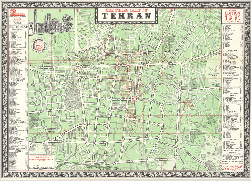 A comprehensive plan of central Tehran, the Key identifies the locations of all the Government Ministries, embassies and legations, travel agencies, hotels, museums, bookshops, banks, libraries, “Important Trading Houses”, “Commercial Counsellors”, and “Cosmetics and Patterns” (ie Avon), also the Sahab Geographical and Drafting Institute, Air Force Headquarters, the Doshan-Tappeh Airport, and the Pahiavi Hospital.