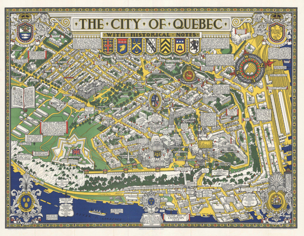 This eye-catching pictorial map of Quebec City is in the style of Macdonald Gill, best known for his humorous London Underground map. The densely filled map displays parks, buildings, named streets and historic notations. A note in the bottom right corner states that "this map commenced in 1926 - completed in 1932 -... Dimensions & proportions must not be taken seriously. It being the intention of the author to amuse & instruct".