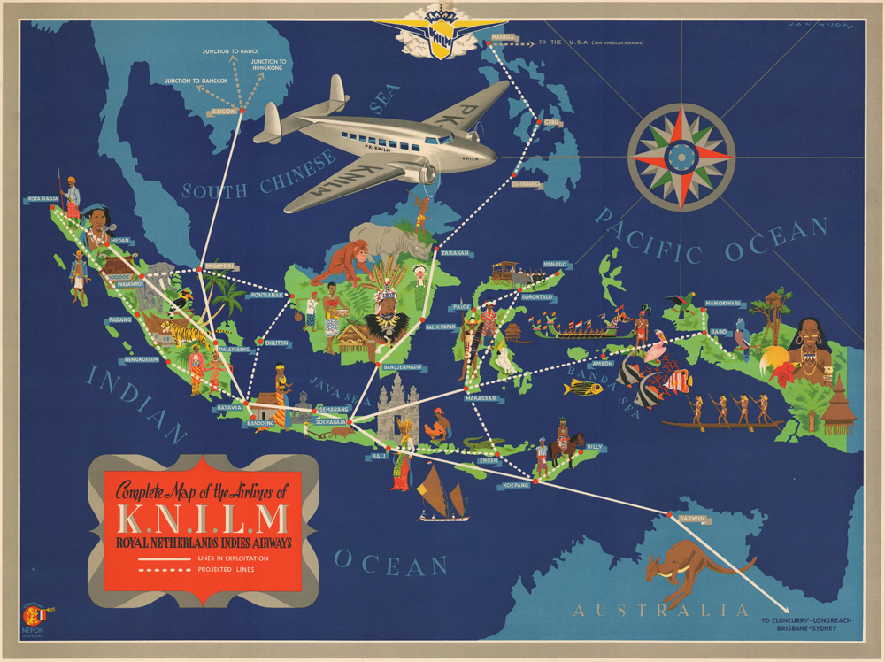 Jan Wijga (1902-1978), known as “Wyga”, was a Dutch Art Deco painter, designer, and illustrator active in Holland in the mid-twentieth century. Wijga worked extensively for KNILM (Royal Dutch Indies Airways) and various beer companies, producing posters and other promotional material. Other cartographic images by Wijga include a smaller but similar map focusing on Bali/Lombok, and an ethnographic game-map of the world.