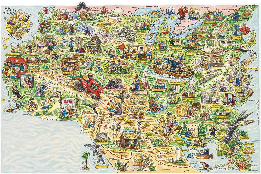 A lively, witty and fascinating pictorial map showing the digital landscape of the united states in 1984. The three main divisions depicted are Silicon Valley, Silicon Alley, and Silicon Prairie, with fun plays on names such as ‘Silicon Sally’, the ‘Cracker 2000’, the cities of ‘Ram and Rom’, and GIGO (garbage in/garbage out).