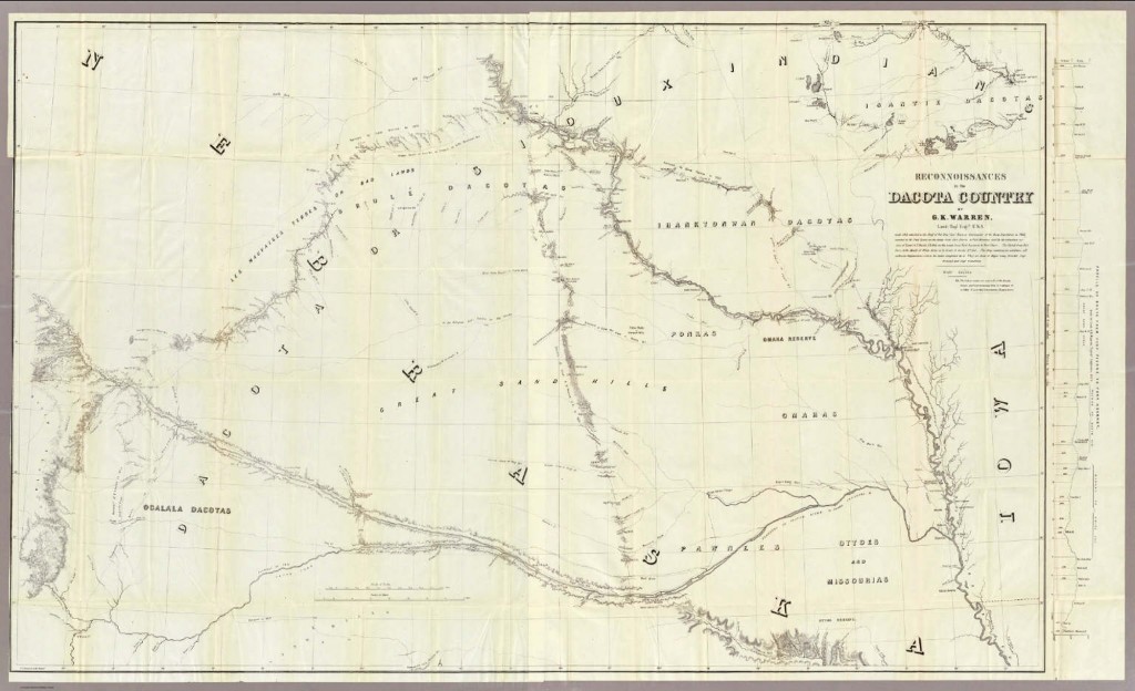 ‘Reconnaissances in the Dacota Country  by G.K. Warren... made while attached to the Staff of Bvt. Brigr. Genl. Harney, Commander of the Sioux Expedition in 1855’. This large map was printed on two sheets and joined. It covers the region from Omaha north to Fort Ridgley (MN) and west to Fort Laramie (WY). Shows the path of Warren's exploration throughout the region with encampment dates noted. Also depicts previous explorers routes including Long, Fremont, Stansbury and Nicollet. Presents good detail of topography, the river systems, and thelocation of numerous Indian tribes and reserves.