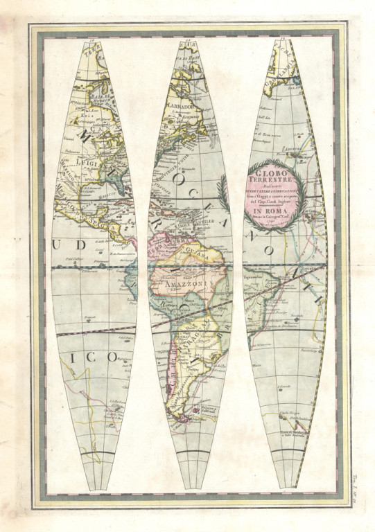 A beautiful, complete set of gores for the construction of Giovanni Maria Cassin i's 1792 terrestrial and celestial globe pair, including the calottes and printed matter for the horizon and meridian rings. The gores are paired in four bordered sheets for each globe, plus two sheets containing each globe's calottes and labels for meridians. The set also includes the labels, printed to two sheets dated 1795, for the armillary sphere intended to accompany the globes. All are superbly engraved and beautifully colored, and are evocative artifacts of the world and its place in the universe as understood at the end of the eighteenth century