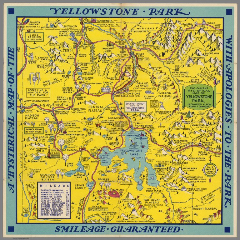 The “Famous Hysterical Map of Yellowstone Park including a few minor? Changes”, was first published in 1936. "Hatched & Scratched by Jolly Lindgren", it includes most of the humor of the previous iterations, and includes a mileage chart in the lower left corner.