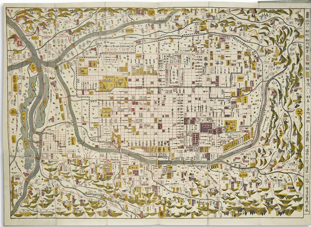 A Tenmei era, colour-printed woodblock map of Kyoto, Japan, oriented with north to the left, created during the reign of Emperor Kokaku, who came to power during a great famine, but whose reign (1780-1817) is generally thought to have been peaceful. He is the last emperor to have abdicated, although the current emperor, Akihito, has formally stated his intention to abdicate in 2019.