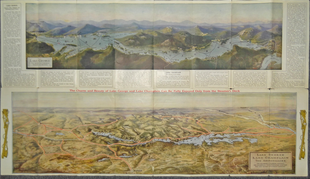 Two elegant maps, one shows both lakes from Albany to Montreal, and the other Lake George and environs in more detail. The former is signed by Green in the image and dated 1911. Green was a local painter, illustrator in the Buffalo area of upstate New York. He is best known for the work he did for the US government during World War I, creating the iconic Liberty Loan posters. He also accepted commissions for the Santa Fe and Southern Pacific Railroads, including The Apache Trail and The Grand Canyon; and created a visually striking panoramic view of Niagara Falls.