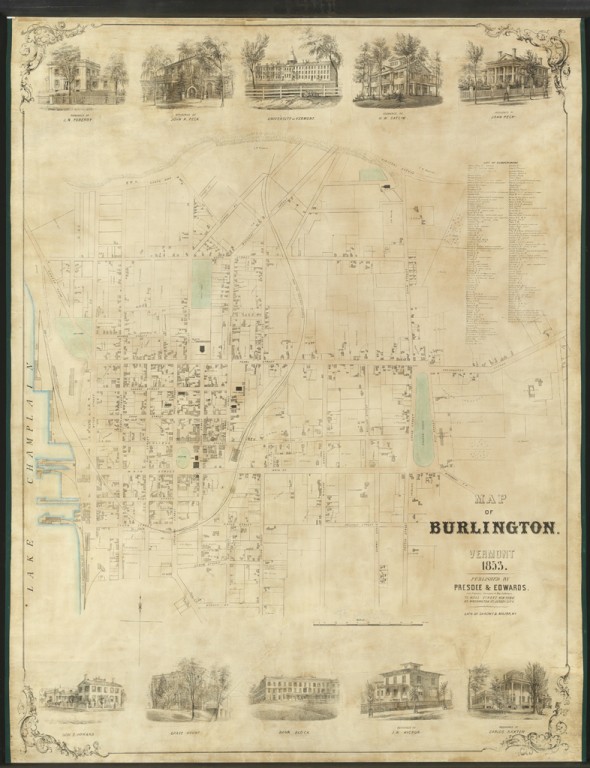 The vignettes include the University of Vermont, the very fine residences of J.N. Pomeroy, John H. Peck, H.W. Catlin, John Peck, Sion E. Howard, J.W. Hickok, and Carlos Baxter, the Grass Mount and the 'Bank Block'. At left is a long list of well over 100 subscribers, representing Burlington’s business and professional elite as well as a wide variety of trades.
