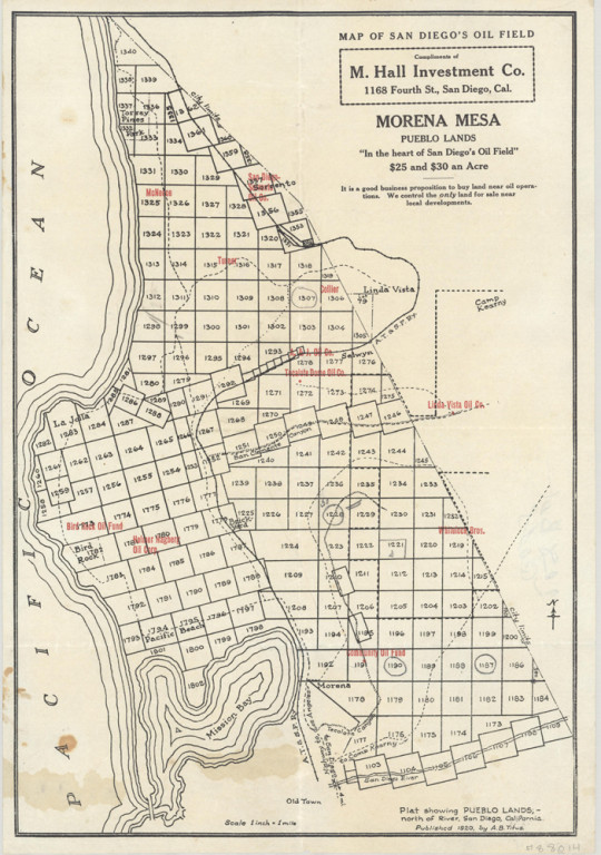 The only known example of this map showing supposed oil drilling operations in the La Jolla, Pacific Beach, Clairemont, and Bay Park neighborhoods of San Diego, published for M. Hall Investment Co. in 1920.