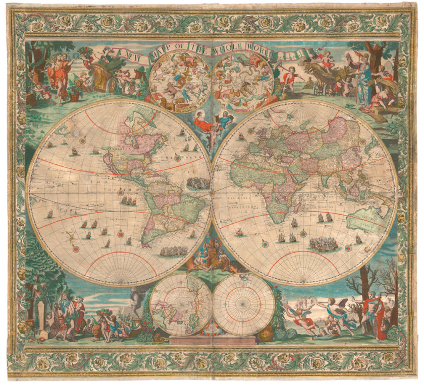 The map describes the world in two hemispheres, with two smaller pairs of hemispheres above and below, showing the heavens and the polar regions respectively. This design reflects the world maps published by Gerard Valk at the end of the seventeenth century, but Overton’s geographical configuration is notably less sophisticated, corresponding more closely to the maps of the 1660s