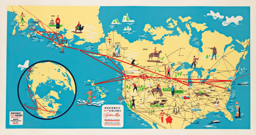 Pictorial route map for Northwest Orient Airlines, issued between 1947, when NWA began flying to Tokyo, Seoul, Manila, and Shanghai, and 1949 when they suspended flights to Shanghai (See Northwest Airlines History Center for similar route maps of the period).