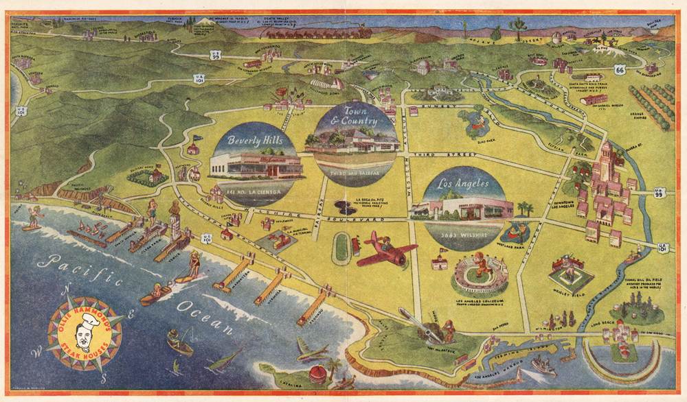 Tourist map of Los Angeles and environs featuring the three Ollie Hammond’s Steakhouses at Beverly Hills (June 1940), Town & County (June 1942), and the original Los Angeles restaurant founded in 1934.
