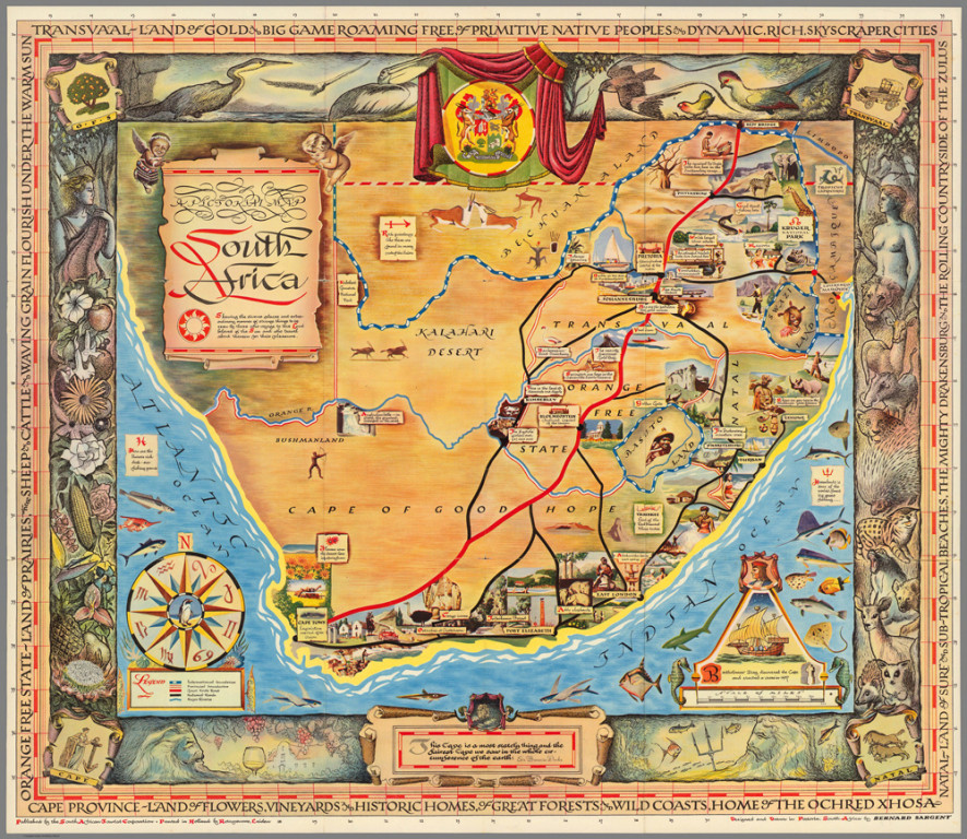 This charming souvenir map was created by Bernard Sargent for the South African Tourist Corporation. The map shows the major roads and the sites that can be seen along those roads, representing "diverse places and extraordinary manner of strange things." An endorsement by Sir Francis Drake is also included: "This Cape is a most stately thing, and the fairest cape we saw in the whole circumference of the earth." The border is filled with images of native flora and fauna and gives brief descriptions of the main regions in South Africa: Transvaal, Natal, Cape Province, and Orange Free State. The map folds into a promotional brochure with additional maps on verso showing transportation routes by air, road, rail and sea and information on Durban and the Kruger National Park. This brochure was printed in the Netherlands by Rotogravure.