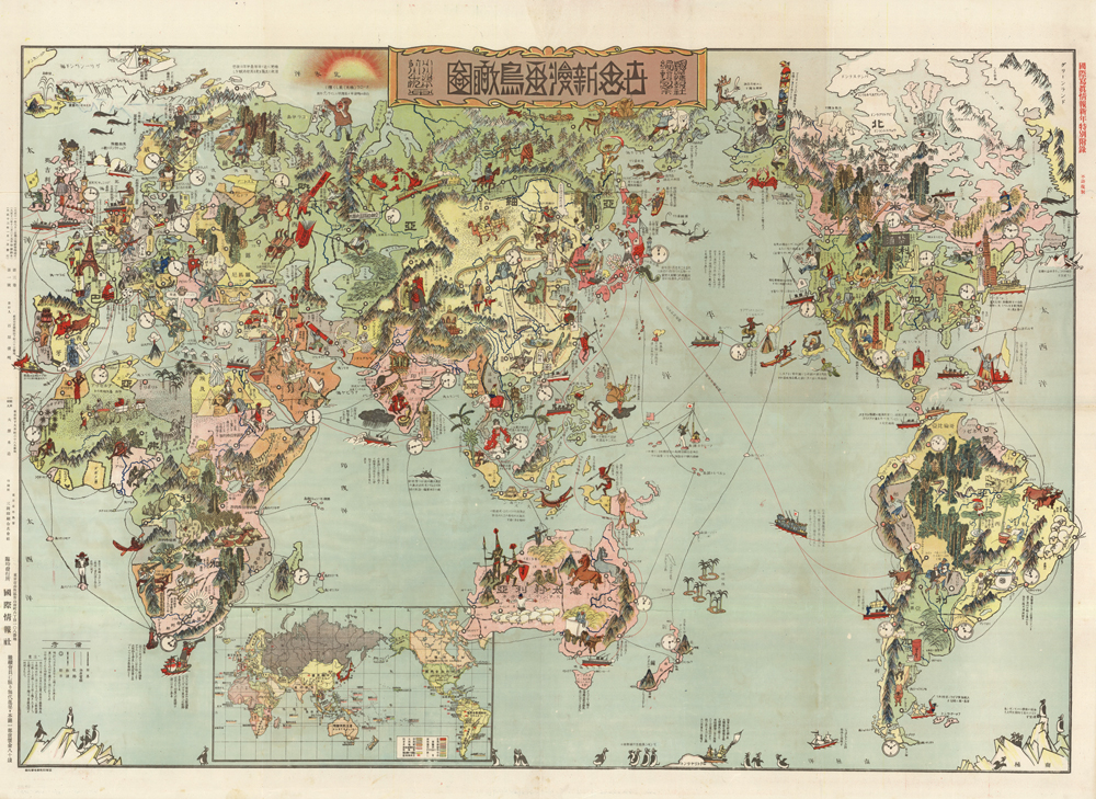 Issued as a supplement to the educational publication ‘Kokuisai shashin jōho / 国際写真情報’, this is a rare Taisho 13 or 1924 Japanese manga (or cartoon) map of the world. Centered on Japan, the map covers most of the known work with the exception of the Atlantic. Cartoon figures illustrate geography, culture, historical events, flora, fauna, and more.