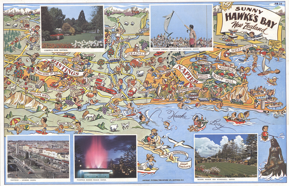A promotional map, probably produced by the local tourist bureau, centred on the towns of Hastings “The Fruit Bowl of New Zealand” and Napier “New Zealand’s Riviera”, in the Heretaunga Plains area, close to Hawke’s Bay, home of “The Famous Marine Parade”.