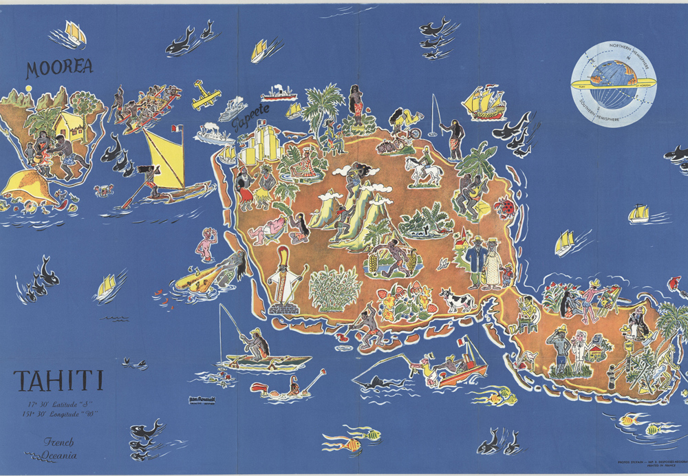 Brightly colored and humorous map by Jean Rousaute showing the peoples, wildlife, and tourists found around Tahiti. On the verso ‘An Invitation to Tahiti’ written by William Stone paints a romantic portrait of this South-Sea paradise, augmented by a reproduction of Gauguin's 'Nave Nave Mahana', 1896. Published in collaboration with L’Agence de la France d’Outre-Mer, le commissariat General au Tourisme, and La Compagnie des Messageries Maritimes.