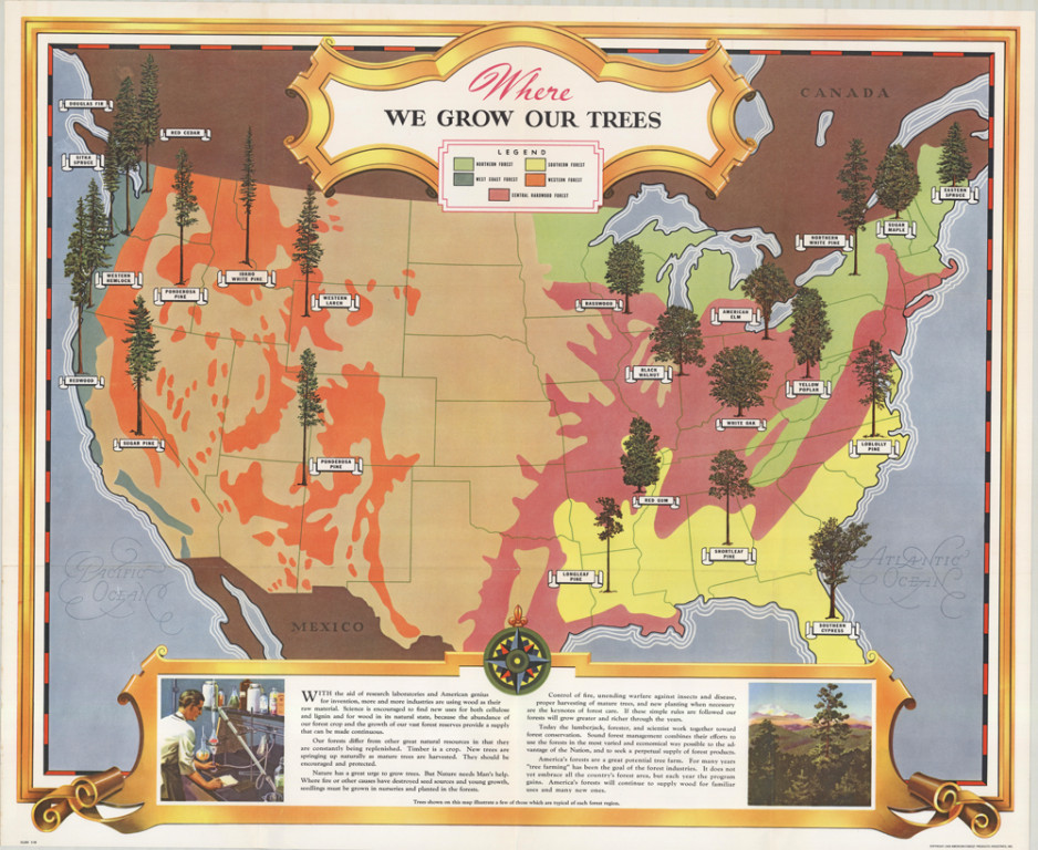 First published in 1943, the map illustrates the different forest regions of the US, and includes vignettes of the trees that are typical of each.