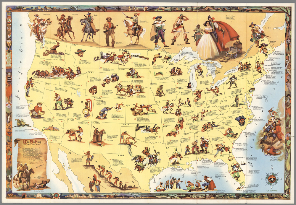 The legend on the map states that it “locates many of the better known treasure sites of the United States. They are scattered from coast to coast… in the denseness of metropolitan centers, in the sands of a hundred islands and in the desolate canyons of remote deserts and mountains. The vastness of the treasure hidden within these boundaries is beyond calculation. Here’s pirate gold, bandit loot, hoarded wealth, Spanish riches – and buried fortunes for all who can find them. For the general locations of over 300 reported buried treasure sites, refer to your Secret Treasure Guide. Wild Bill Hickok”.