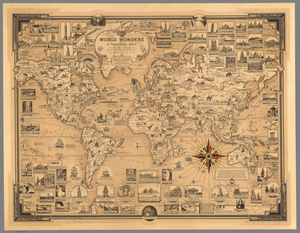 Chase’s Wonders of the World, include: engineering, architectural and artistic achievements of mankind through the ages, as well as marvels of nature; the Statue of Liberty, Empire State Building, Mayan temples, Egyptian Sphinx, Great Wall of China, Kremlin, Stonehenge, Hindenburg; and the Mona Lisa. Representing natural marvels are mountains and national parks such as Yellowstone, as well as animals such as the kangaroo, rhinoceros, buffalo and grizzly bear. Numerous inset illustrations with brief descriptions surround the map, including the “Seven Wonders” of the ancient world. The map is executed on Mercator’s projection with a decorative cartouche. It is printed in sepia tones highlighted with a colorful compass rose in red, yellow and orange, the border with ornate Art Deco corners.