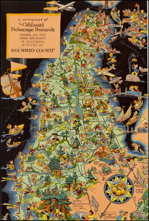 Taylor White’s pictorial maps, often known as cartographs, combine graphic style, color and comical observations. One of Ruth’s earliest commissions was for Frank’s alma mater, Stanford University: the front cover of “The Stanford Illustrated Review”, November 1927.